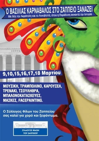 Ένα ευφάνταστο αποκριάτικο σκηνικό στήνεται στο Ζάππειο, με θέα την Ακρόπολη και το Λυκαβηττό. Στο σημείο όπου η παράδοση συναντά την ιστορία ο Σύλλογος Φίλων του Ζαππείου θα «ξαναζωντανέψει» τον Βασιλιά Καρνάβαλό στις 9,10,15,16,17,18 Μαρτίου 2013.