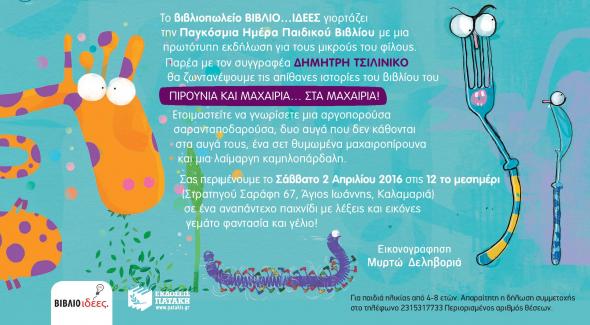 Εκδήλωση για το βιβλίο «Πιρούνια και Μαχαίρια..στα Μαχαίρια» του Δημήτρη Τσιλινίκου (εικονογράφηση: Μυρτώ Δεληβοριά) για την Παγκόσμια Ημέρα Παιδικού Βιβλίου